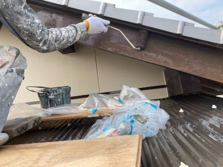 上塗りを施工しています。塗りムラも無くなり艶が出てきれいに仕上がっていきます付帯塗装
