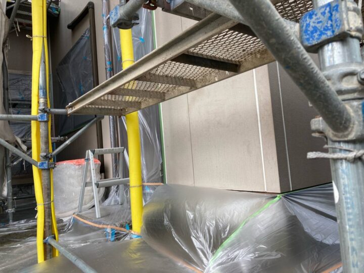 周り4面に足場を組み立てています。安全性を重視して塗装の職人さんが作業をしやすい足場を組み立てます。高圧洗浄