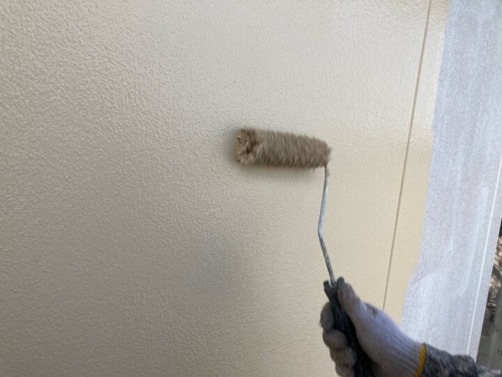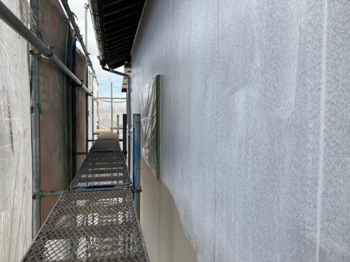 今回は外壁材がサイディングボードですので、上塗り材と外壁の密着性を高める専用のシーラーを塗装致しております。外壁中塗り