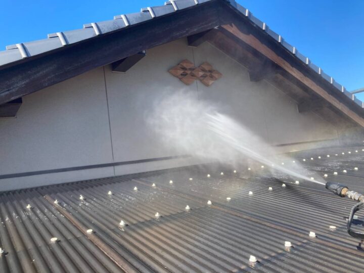 高圧洗浄でしっかりチョーキング、コケ、汚れを落としていきます。養生