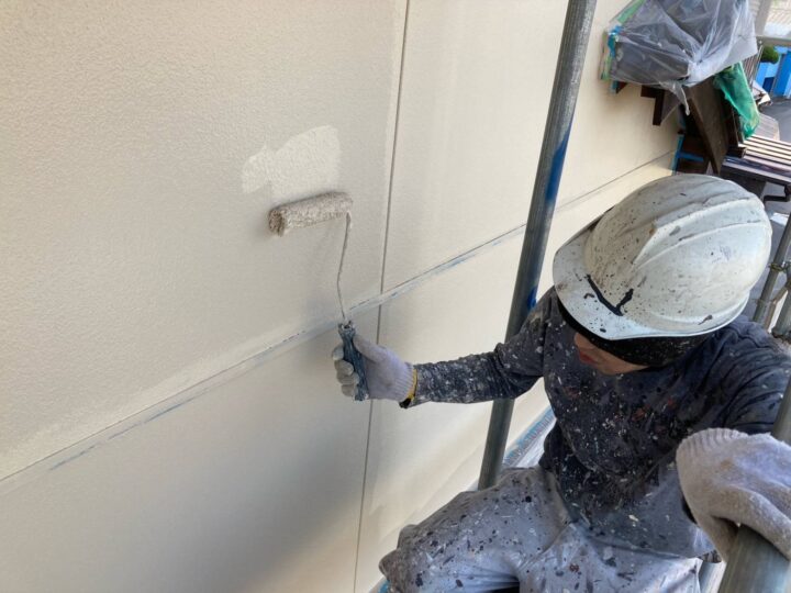 中塗りを施工しています。お客様の選んでいただいたお色で全体を塗装していきます。色や雰囲気がわかる様になります。外壁上塗り