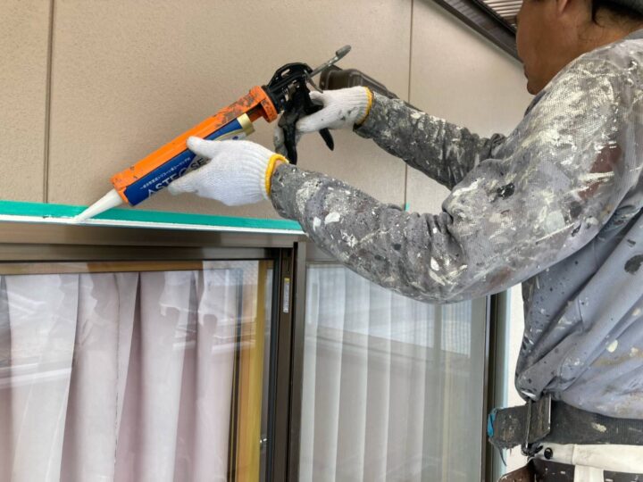 塗らない部分、塗料の飛散してはいけない部分はビニール等で養生しておきます。またテープ養生をしっかり行う事で養生を外した際綺麗なラインが出て仕上がりがきれいになります。コーキング増し打ち