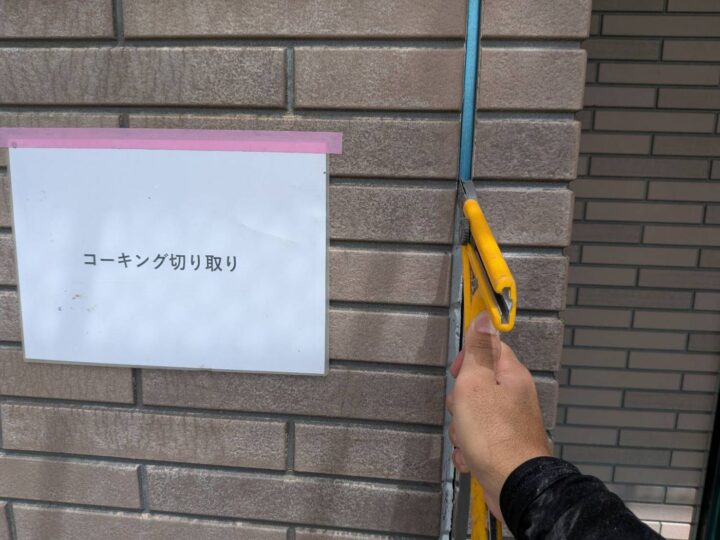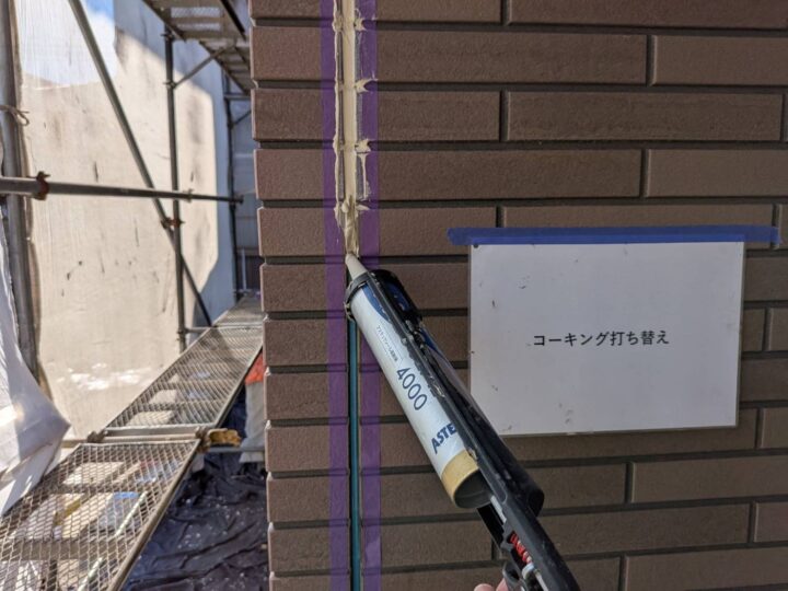 コーキングを撤去して新しいコーキングを打設しています。コーキングは塗料の耐候年数に合わせたコーキングを使用致しております。