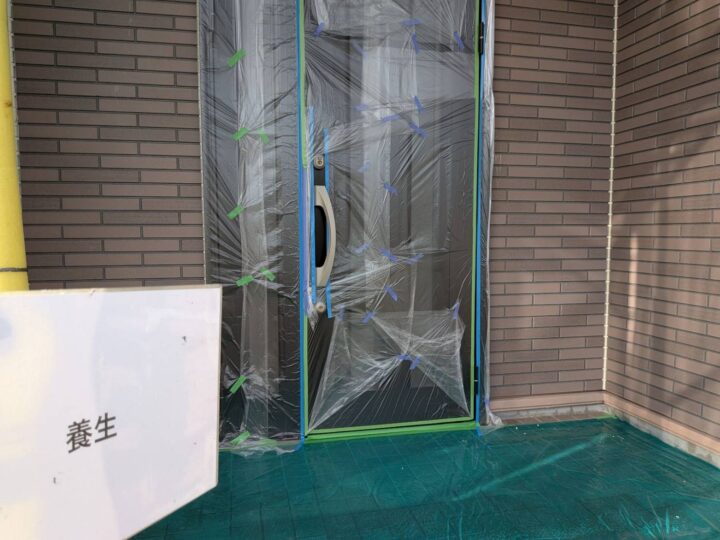 塗らない部分、塗料の飛散してはいけない部分はビニール等で養生しておきます。またテープ養生をしっかり行う事で養生を外した際綺麗なラインが出て仕上がりがきれいになります。
