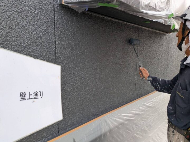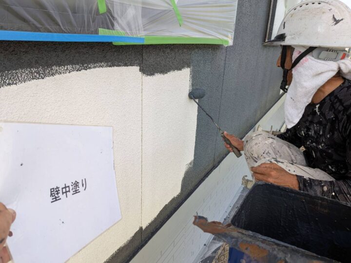 中塗りを施工しています。しっかり膜厚をつけて塗り込んでいきます。中塗り完了しますと全体の雰囲気が分かる様になります。