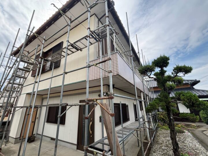 足場を組み立てています。足場を組む際はご近所にあいさつ回りを事前に行っております。
