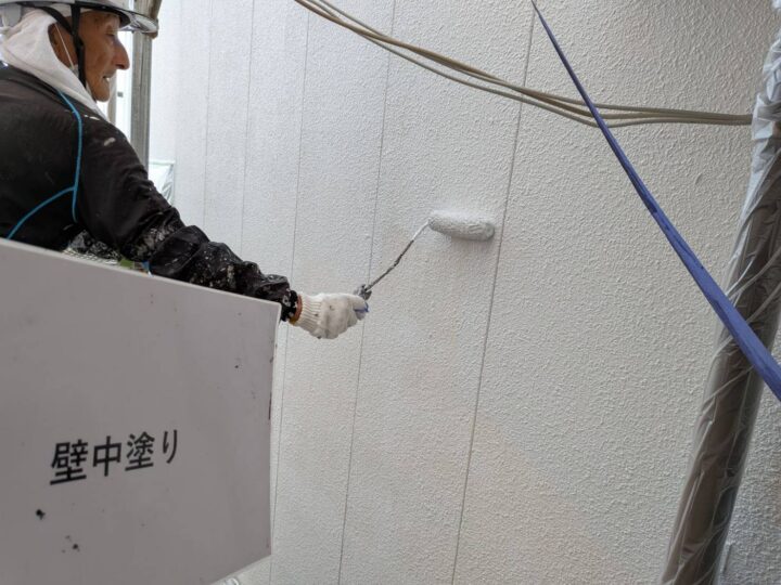 中塗りを施工しています。しっかり膜厚をつけて塗り込んでいきます。中塗り完了しますと全体の雰囲気が分かる様になります。