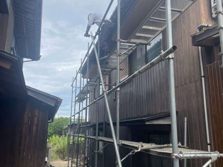 足場を組み立てています。足場を組む際はご近所にあいさつ回りを事前に行っております。