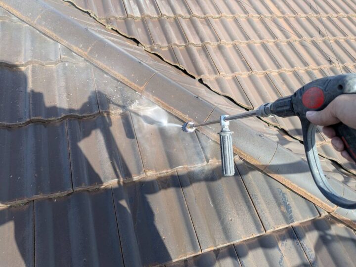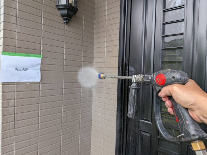 高圧洗浄でしっかりチョーキング、コケ、汚れを落としていきます。