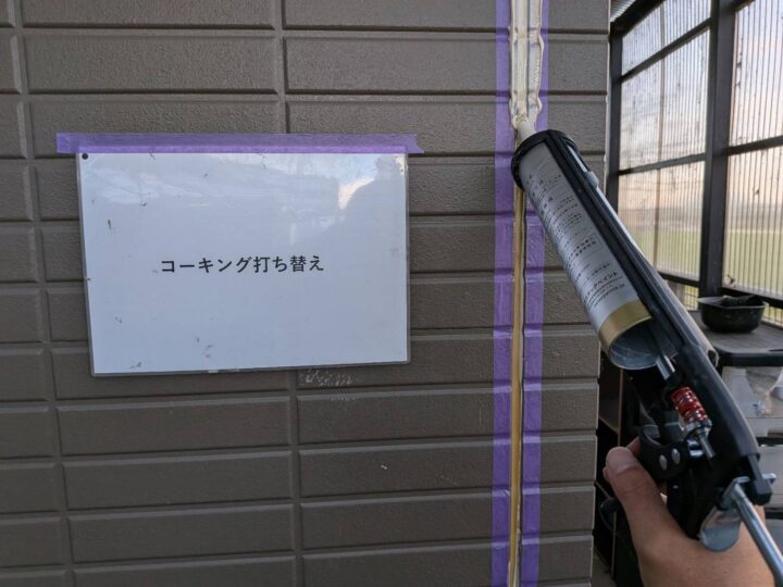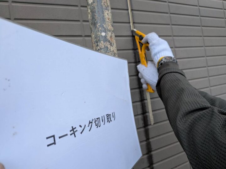 劣化したシーリング材(コーキング)をカッターなどで取り除く作業です。外壁や窓まわりの目地に使われており、防水性を保つため、打ち替え前に古いコーキングを撤去する必要があります。