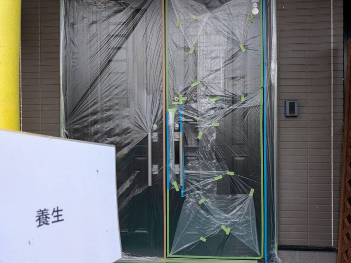 塗らない部分、塗料の飛散してはいけない部分はビニール等で養生しておきます。またテープ養生をしっかり行う事で養生を外した際綺麗なラインが出て仕上がりがきれいになります。