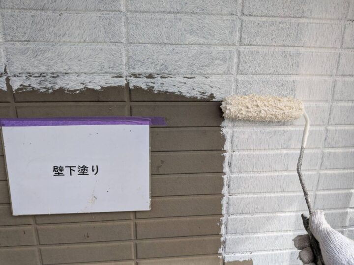 中塗りを施工しています。しっかり膜厚をつけて塗り込んでいきます。中塗り完了しますと全体の雰囲気が分かる様になります。