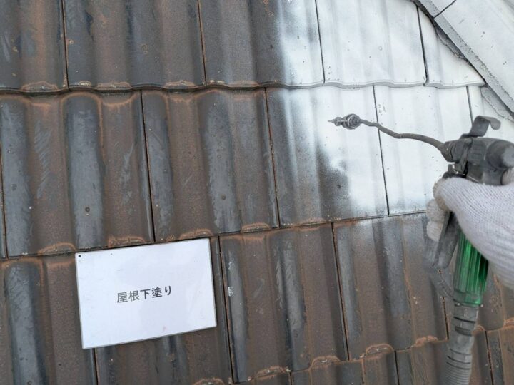 屋根の下塗りの様子です。メーカーが定めた建材・上塗り材に合わせた下塗り材をしっかり塗布しております。希釈率・缶数管理は徹底して行っております。