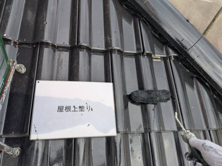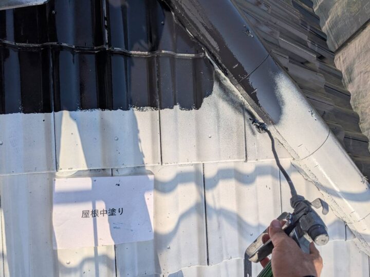 屋根の中塗りの様子です。指定の色で一通り塗装していきます。屋根 上塗り