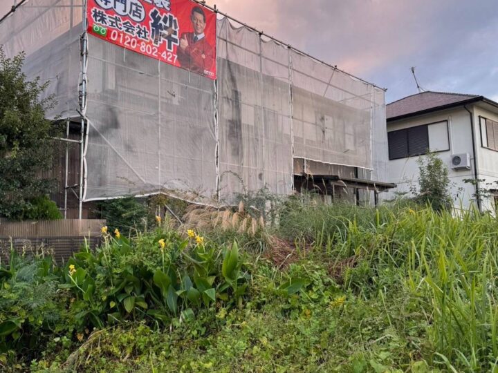 足場を組み立てています。足場を組む際はご近所にあいさつ回りを事前に行っております。