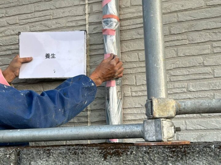 塗らない部分、塗料の飛散してはいけない部分はビニール等で養生しておきます。またテープ養生をしっかり行う事で養生を外した際綺麗なラインが出て仕上がりがきれいになります。