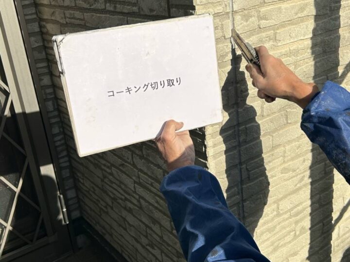 コーキングの撤去を行っております。外壁材やサッシを傷つけないように慎重に行っております。