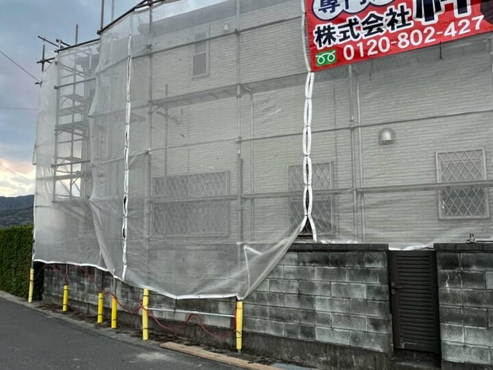 足場を組み立てています。足場を組む際はご近所にあいさつ回りを事前に行っております。