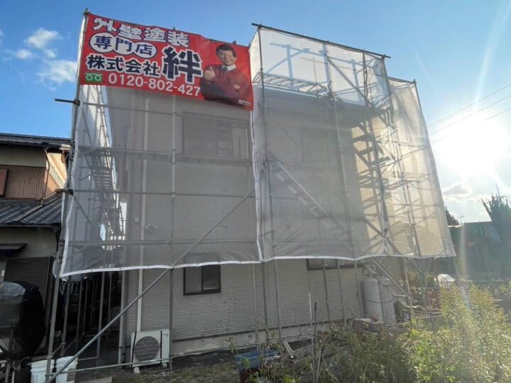 足場を組み立てています。足場を組む際はご近所にあいさつ回りを事前に行っております。