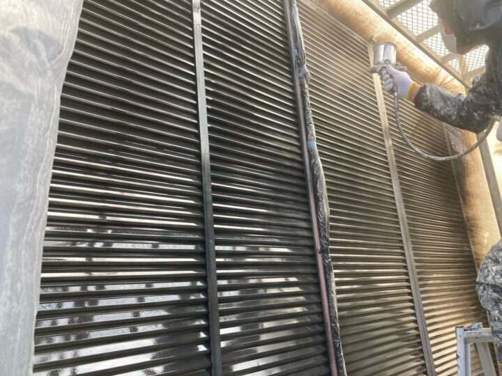 屋根の上塗りの様子です。仕上げ塗りで膜厚をつけて防水性を高めて色のムラが出ないように仕上げています。下塗り同様メーカーが定める希釈率・缶数管理は厳守で行っております。付帯塗装(雨戸)