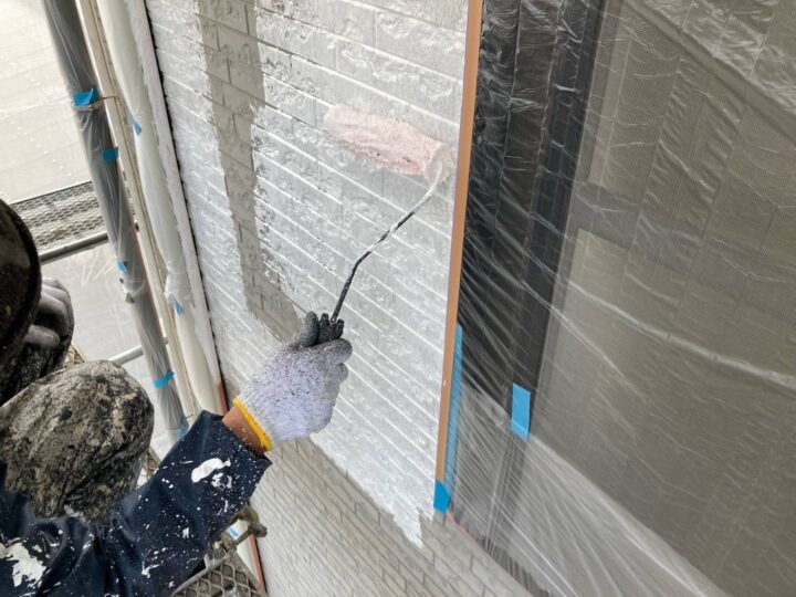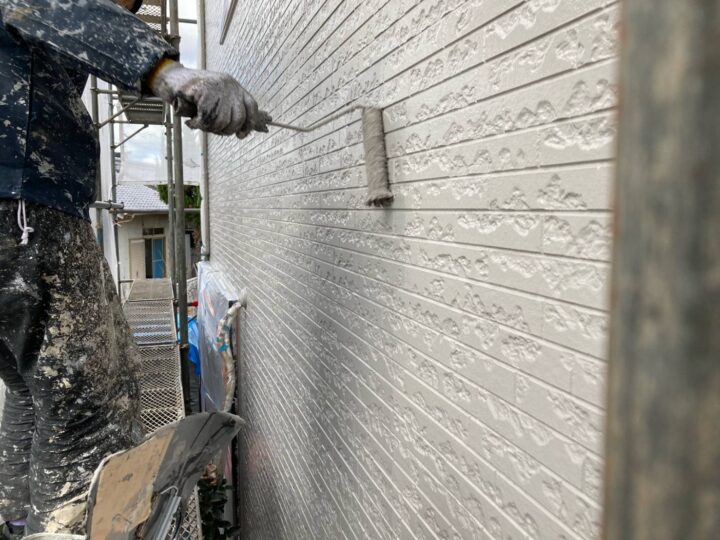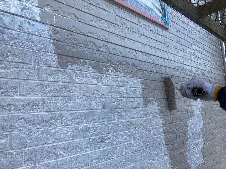 中塗りを施工しています。しっかり膜厚をつけて塗り込んでいきます。中塗り完了しますと全体の雰囲気が分かる様になります。