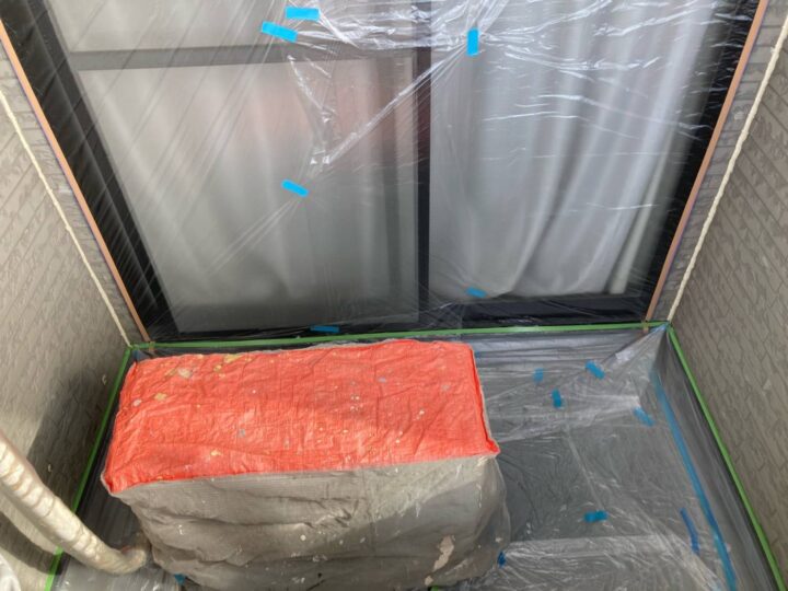 サッシや土間等、塗装しない部分や飛散の可能性のある場所はしっかりビニール養生を行っております。コーキング切り取り
