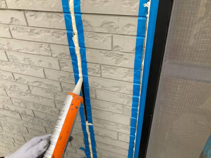劣化したシーリング材(コーキング)をカッターなどで取り除く作業です。外壁や窓まわりの目地に使われており、防水性を保つため、打ち替え前に古いコーキングを撤去する必要があります。コーキング打ち替え