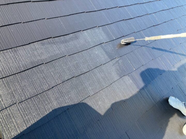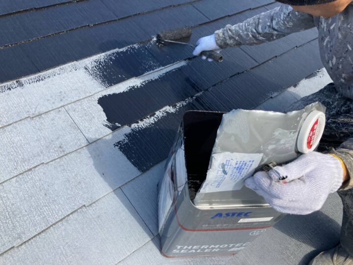 屋根の下塗りの様子です。メーカーが定めた建材・上塗り材に合わせた下塗り材をしっかり塗布しております。希釈率・缶数管理は徹底して行っております。