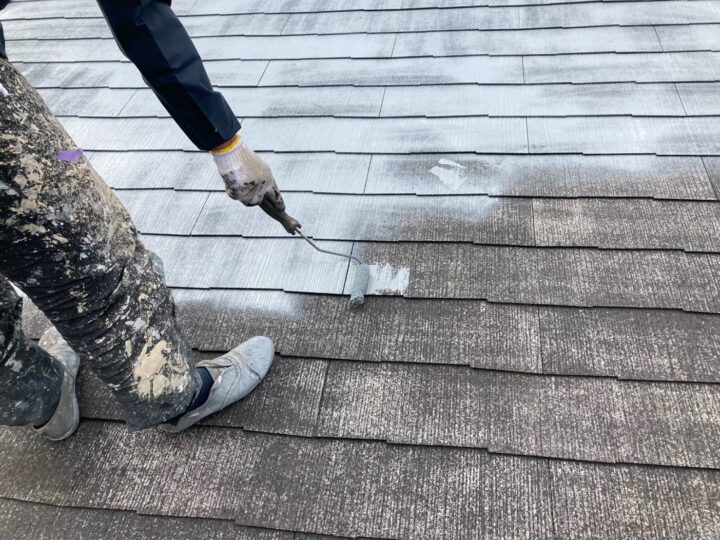 屋根の中塗りの様子です。指定の色で一通り塗装していきます。屋根 上塗り