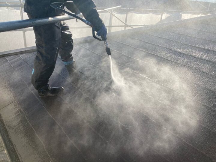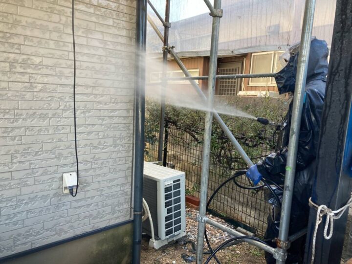 高圧洗浄でしっかりチョーキング、コケ、汚れを落としていきます。